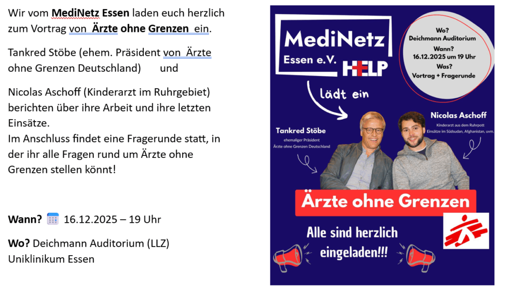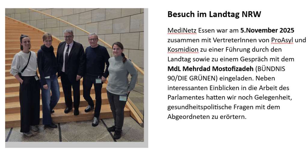MediNetz Essen ist eine Menschenrechtsinitiative, die sich zum Ziel gesetzt hat, die Gesundheitsversorgung von Menschen ohne Papiere oder ohne Krankenversicherung zu verbessern. Diese sind durch die Gesetzgebung der Bundesrepublik Deutschland ganz oder teilweise von medizinischer Versorgung ausgeschlossen. Wir vermitteln medizinische Hilfe für Menschen ohne Aufenthaltsstatus oder Versicherungsschutz. In den Sprechstunden wird festgestellt, durch welche Ärzt*innen die Behandlung am besten durchgeführt werden kann. Dann vermitteln wir an die Ärzt*innen, die sich bereit erklärt haben, Menschen anonym und kostenlos bzw. kostengünstig zu behandeln. Bei Bedarf können wir Übersetzer*innen vermitteln.